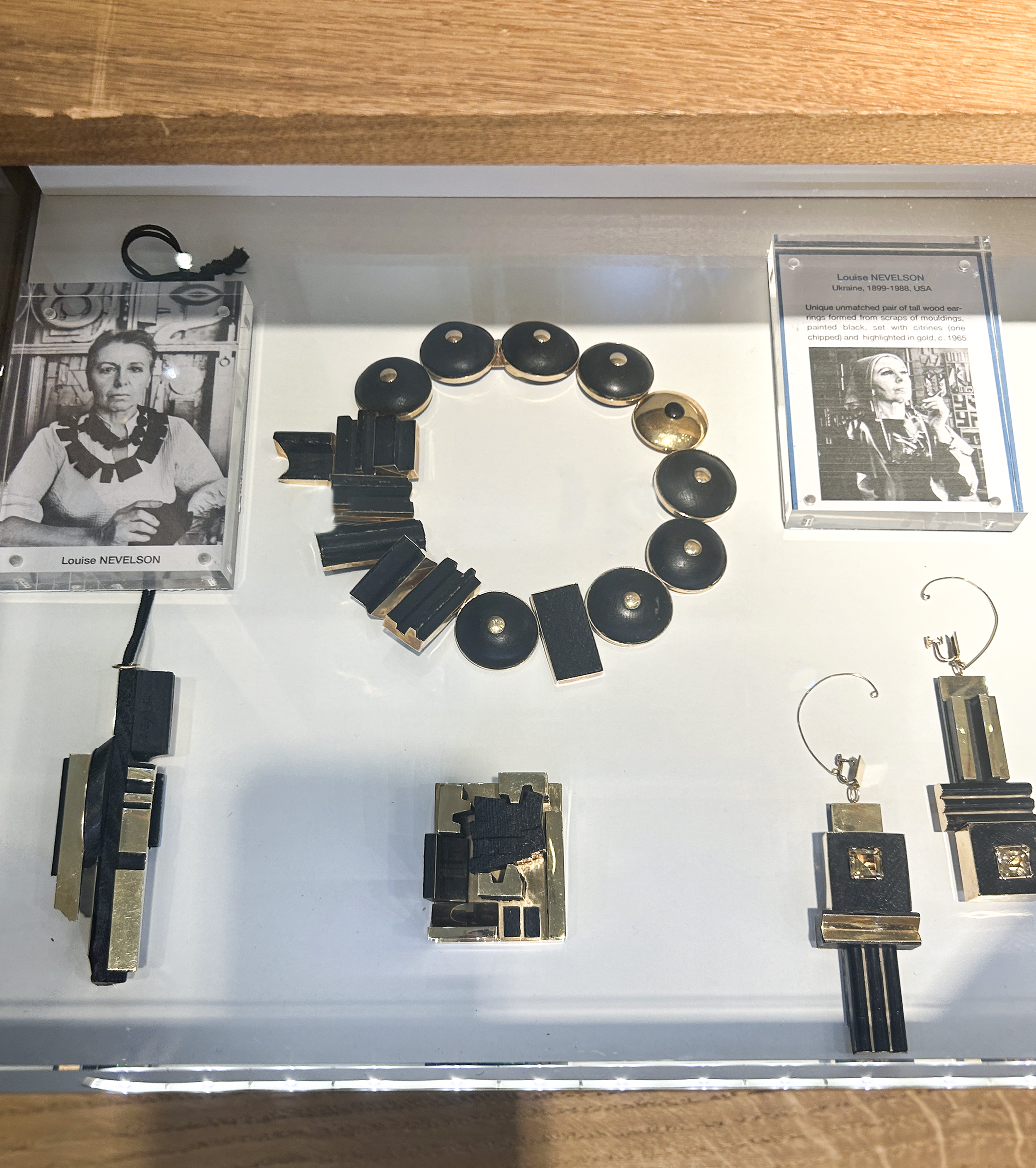 Louise Nevelson, one of the most prominent American sculptors of the 20th century, was known for her black wall assemblages made of found wood fragments, architectural remnants, and layered geometric shadow-box forms. Her work is associated with abstraction, urban materiality, and black as a way of drawing attention to form. This necklace is essentially her sculpture miniaturized for the body.