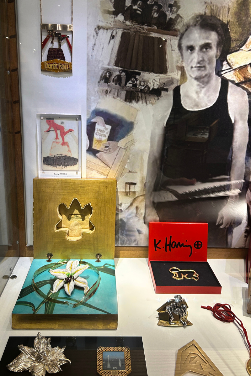 A sculptural flower pendant shown in a Larry Rivers–focused presentation, part of the broader mid-to-late 20th century movement where artists treated jewelry as wearable art. Presented by Didier Ltd.