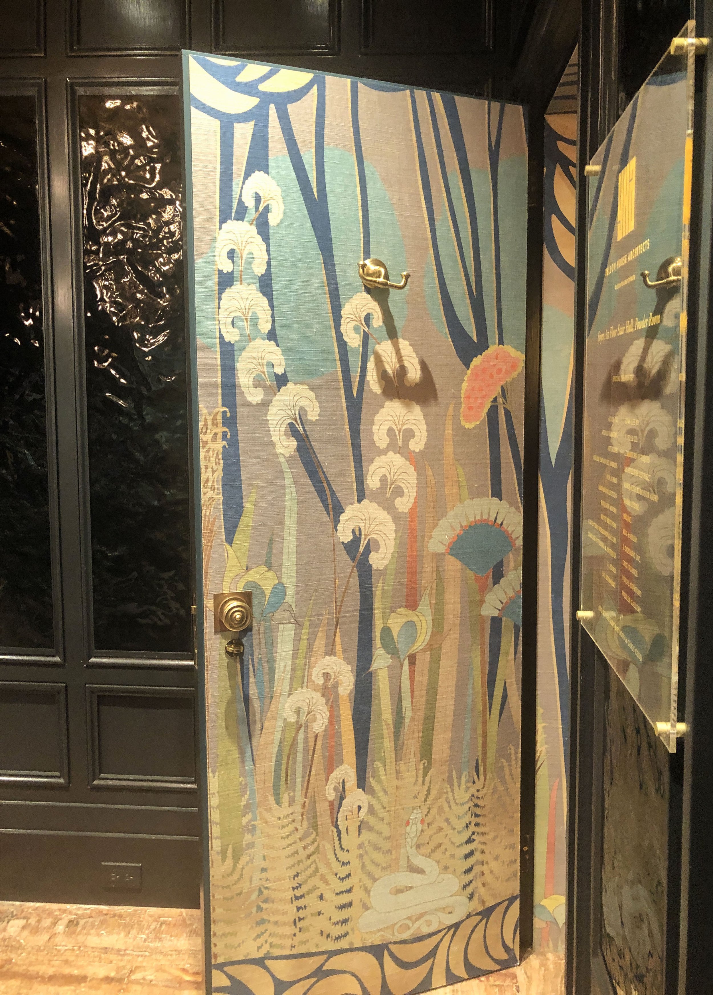 While walls get all the attention, doors can sometimes be neglected. But not by the designers at Yellow House Architects. They designed the lobby of the show house as well as this show-stopping bathroom they call “Enchanted Seduction Powder Room”. The textured floral patterned wallpaper engulfs the bathroom for a “wow, come see this” reaction. And did you peep the patent leather wall covering on the lobby walls? I couldn’t help but want to touch it, and think it would make a really cool door covering too.